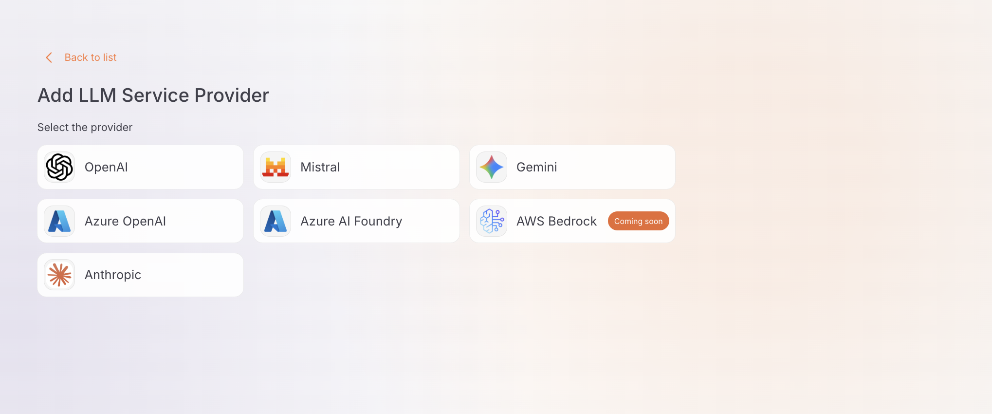 LLM Providers allow you to connect AI service platforms like OpenAI, Anthropic, and others to the AI Workspace. Once configured, these providers serve as the backend for your LLM Proxies, enabling you to route requests through a managed gateway with built-in security, rate limiting, and guardrails.