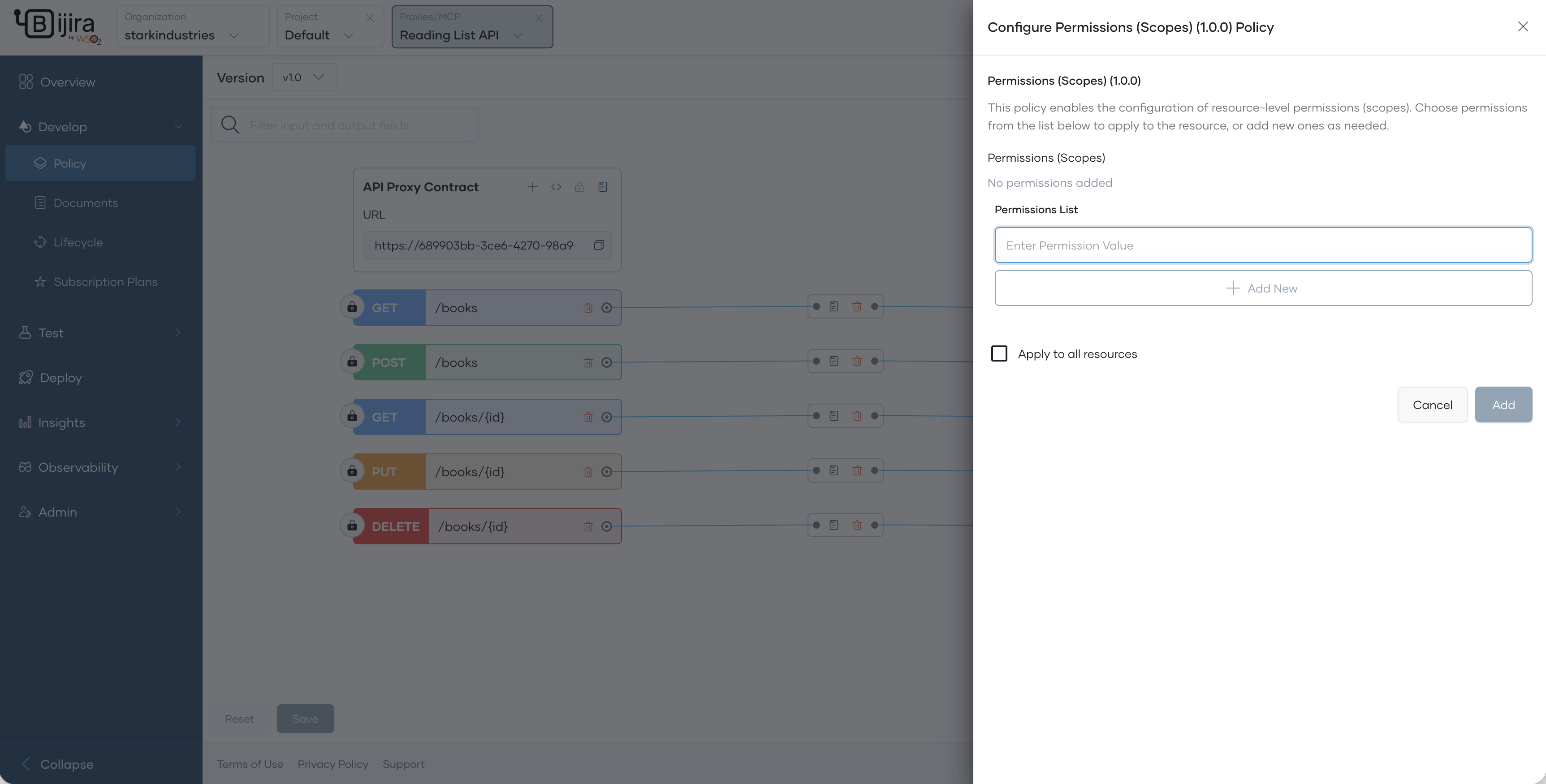 - Once the permissions are configured, click Add and Save the policies and then the API.