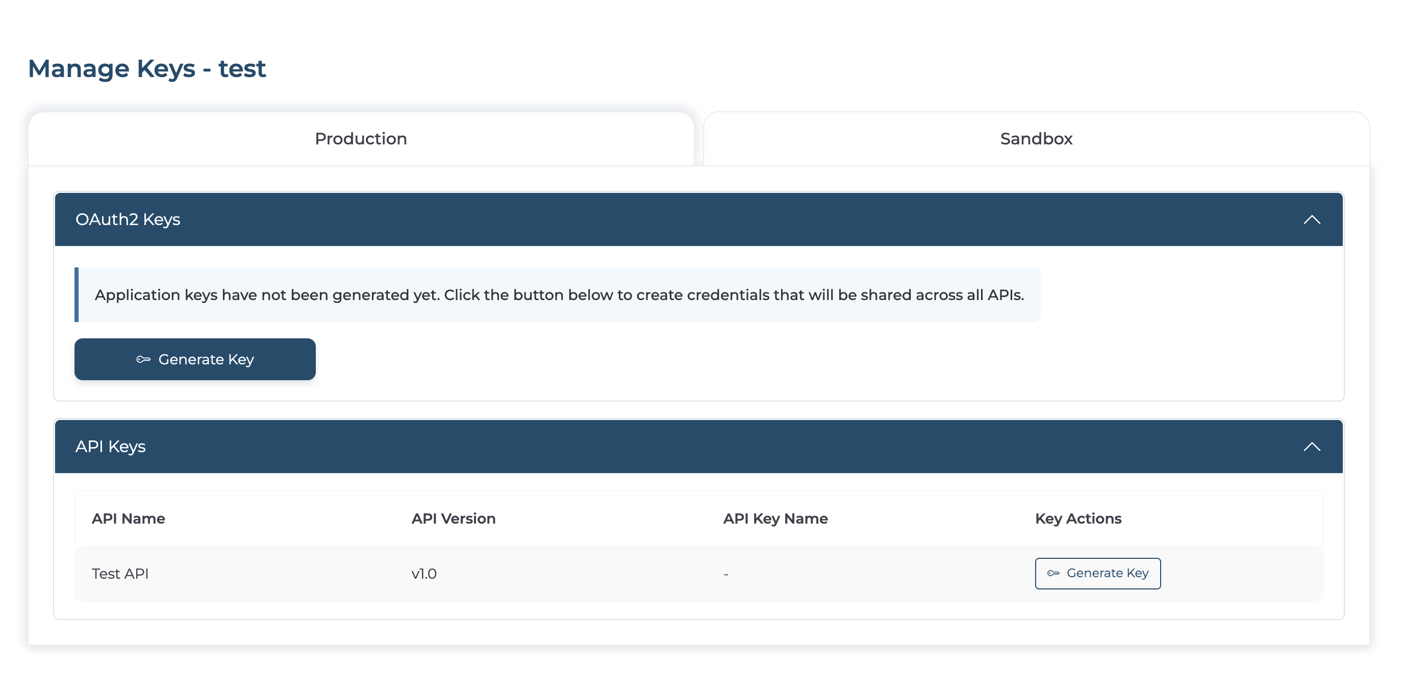 On the Manage Keys page, select either the Production or Sandbox tab based on your requirement.