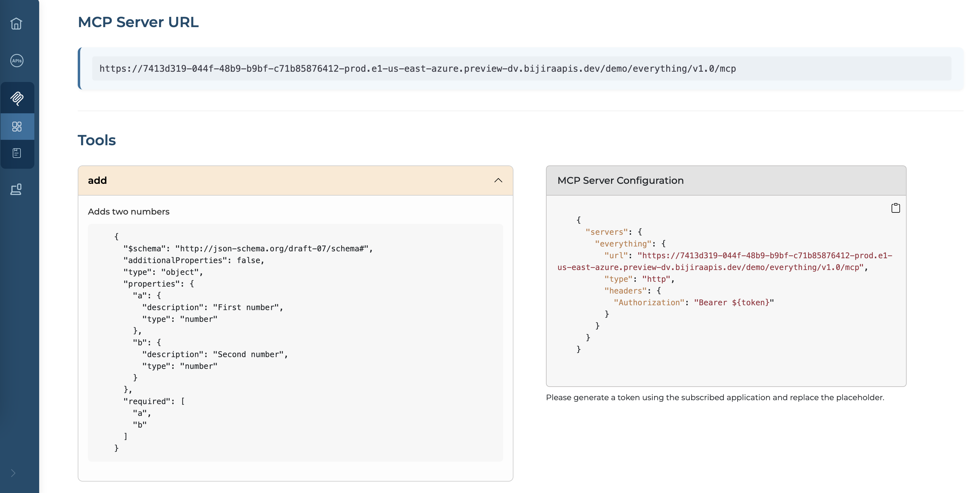 MCP consumers can discover the available tools through this view. Additionally, sample configurations for setting up the MCP Server with an MCP Client can also be obtained from here.