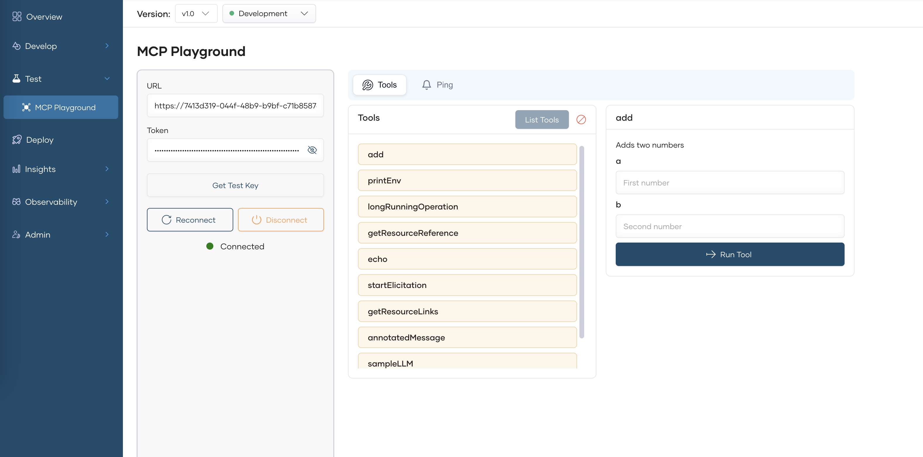 - Select MCP Playground under the Test section.