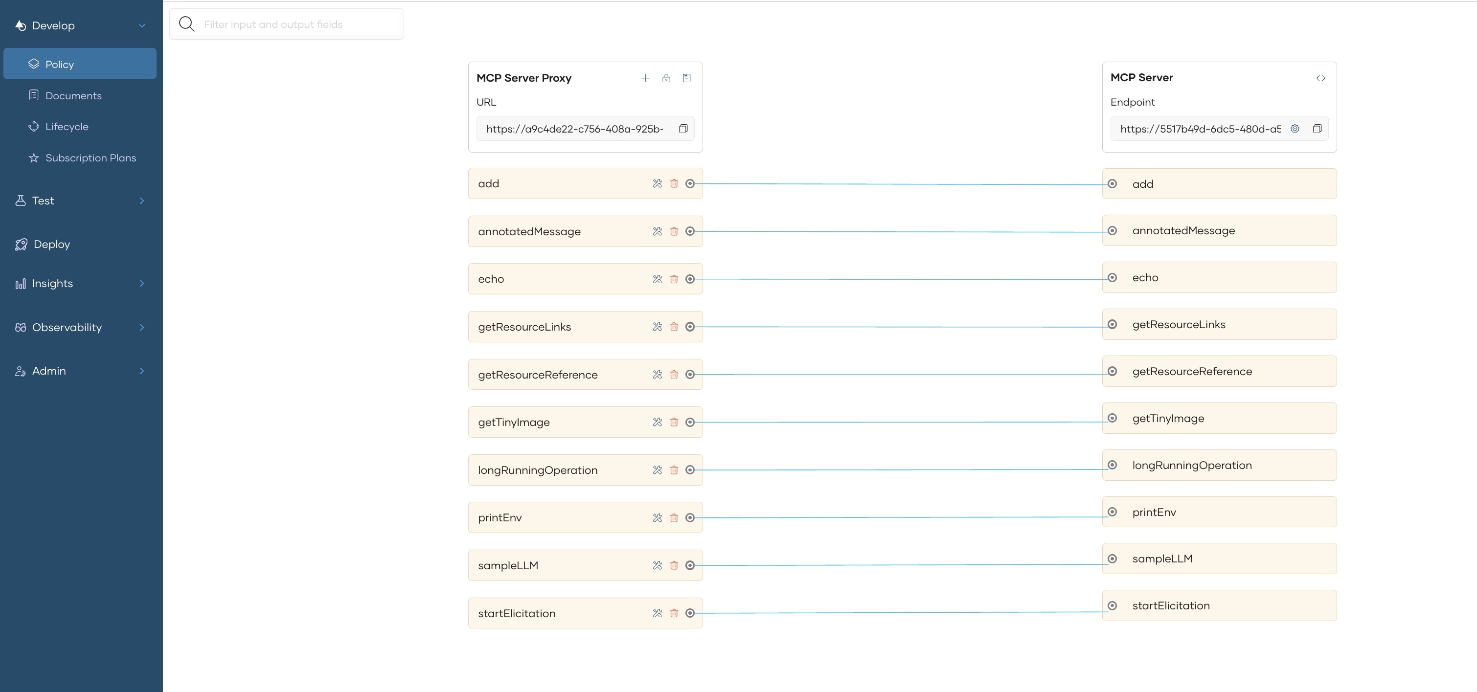 You can modify the details of the Tools of your MCP Server by navigating to the Policy section under the Develop menu. The default tool names, descriptions, and schemas are taken from the actual MCP Server.