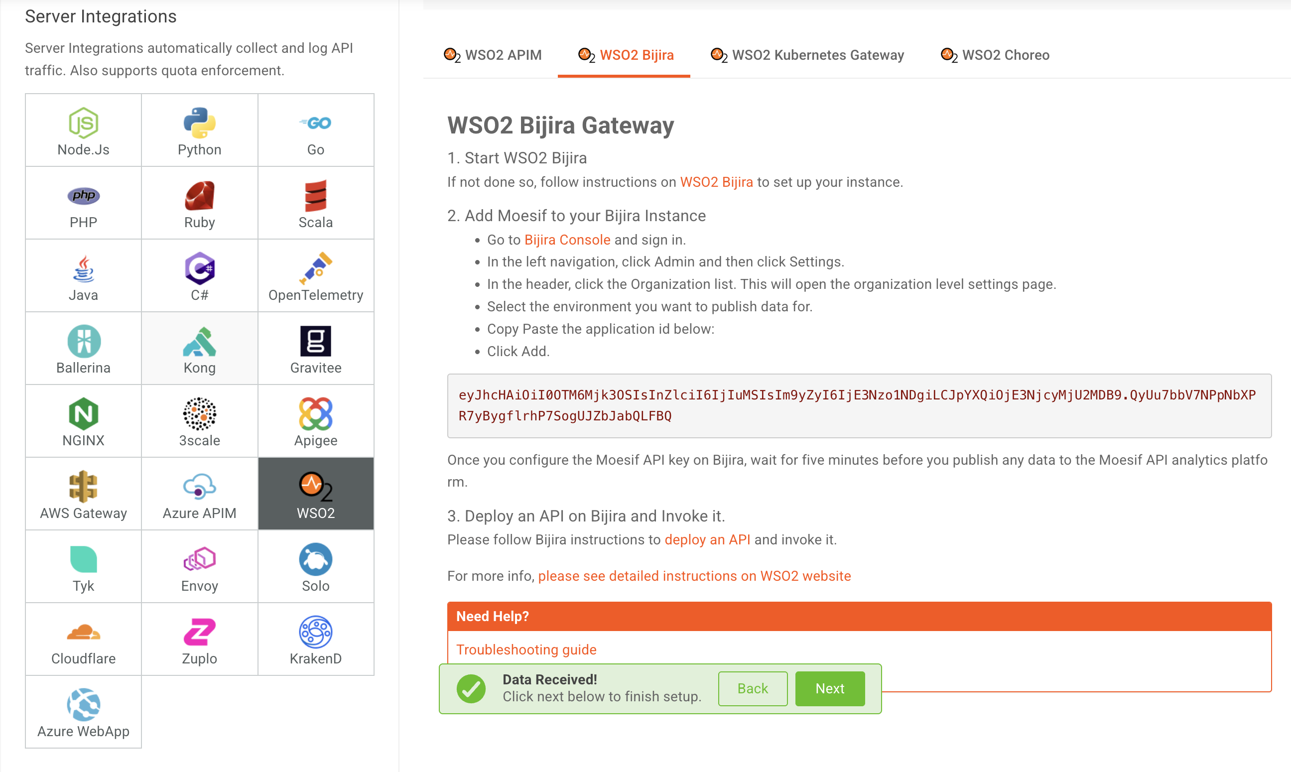 Once you publish data, your Moesif dashboard will receive events. Once Moesif receives events, you will see a notification on Moesif confirming that it received data.