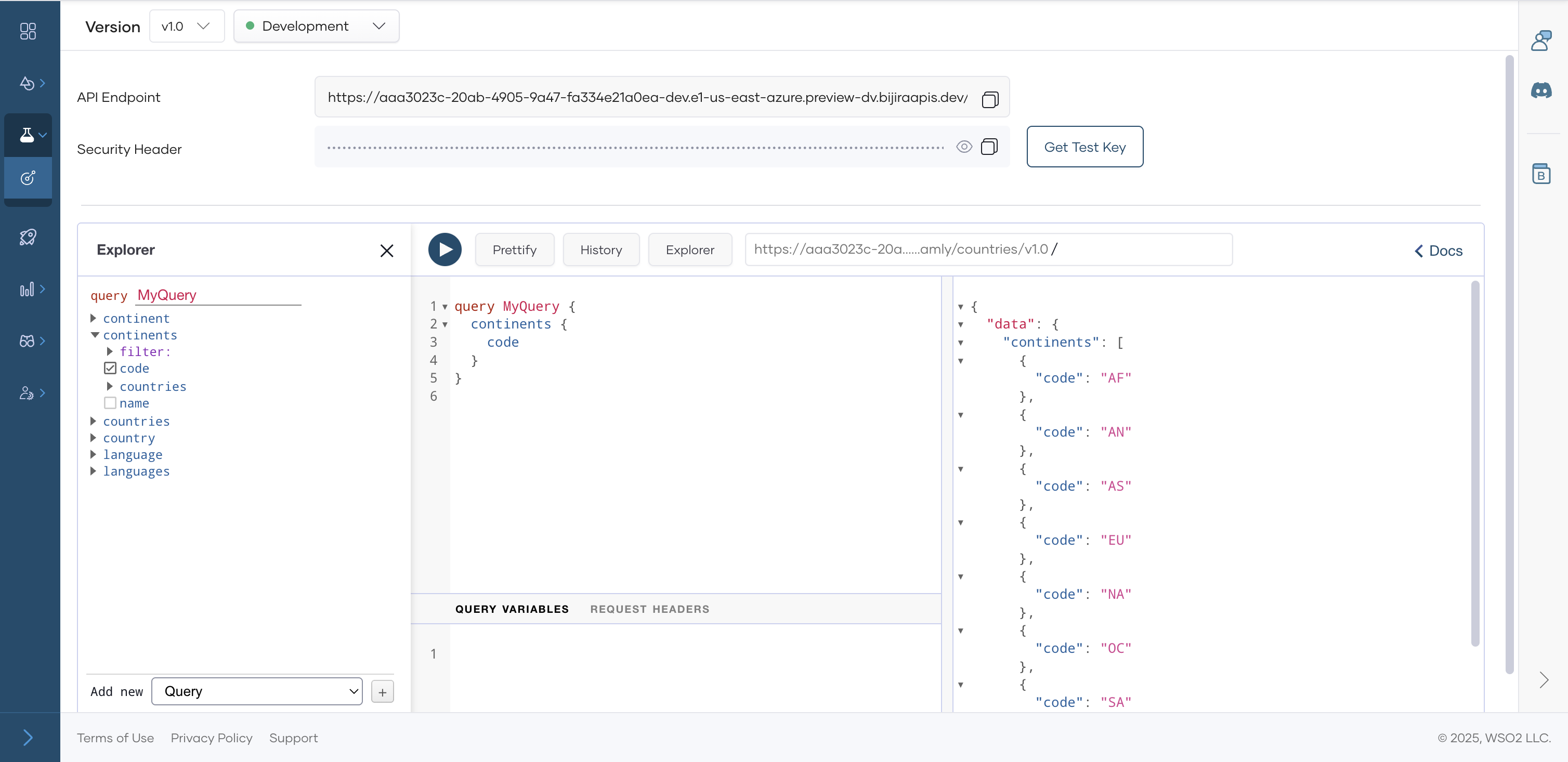 API Platform offers an integrated GraphQL Console to test GraphQL API proxies that you create and deploy. Since API Platform secures APIs with OAuth 2.0 authentication, the GraphQL Console generates test keys to help you invoke your GraphQL operations.